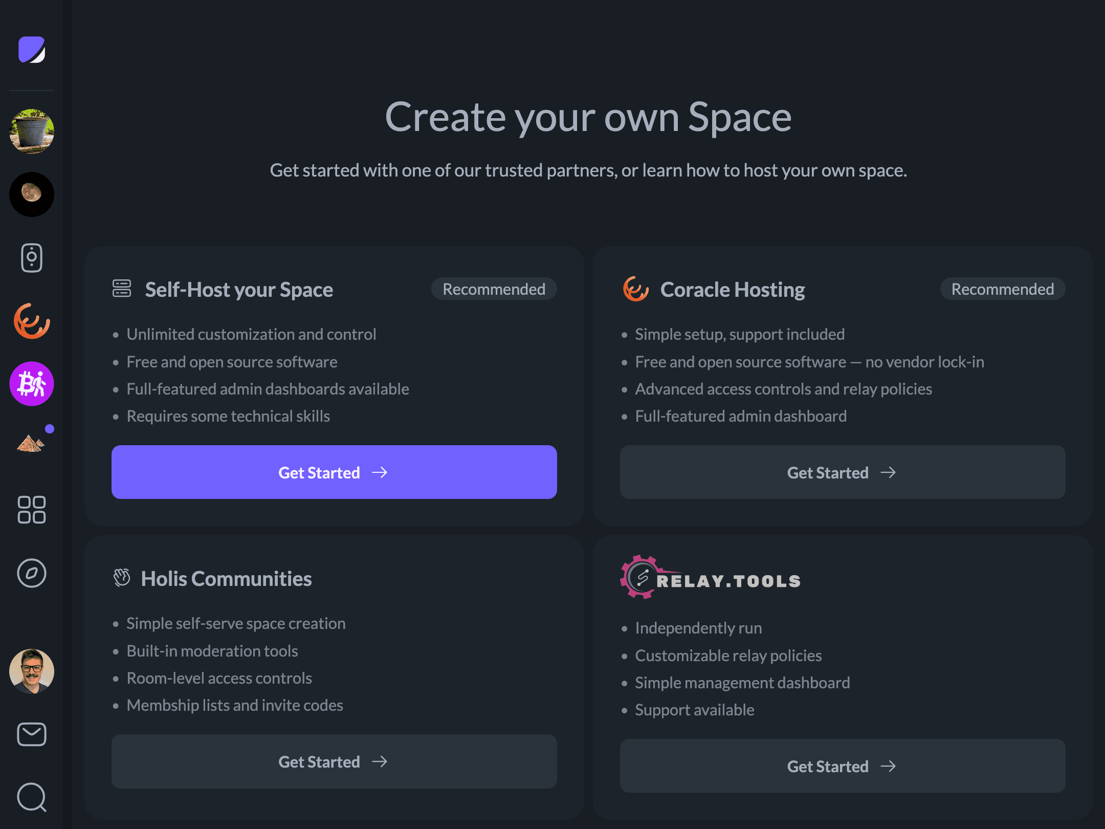 To get started, you'll first want to figure out how you want to host your space. To make things easy, Flotilla's parent company Coracle provides a hosting solution, which you can sign up for here.