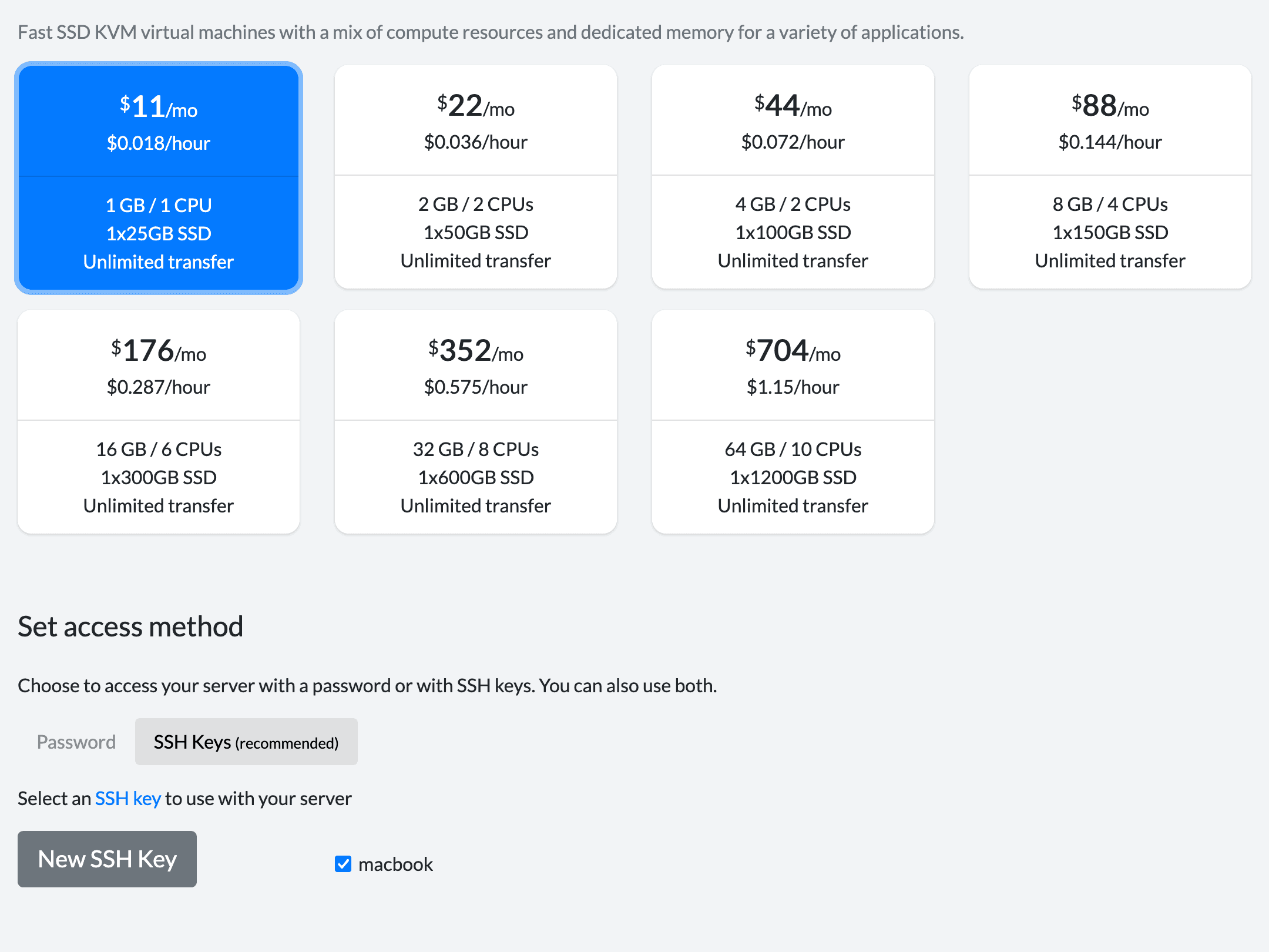 For access, you can pick either a password, or you can upload your ssh public key. Using an ssh key is more secure, and more convenient, but you can always start with a password and switch to ssh later if you prefer. See here for directions on how to set up an ssh key.