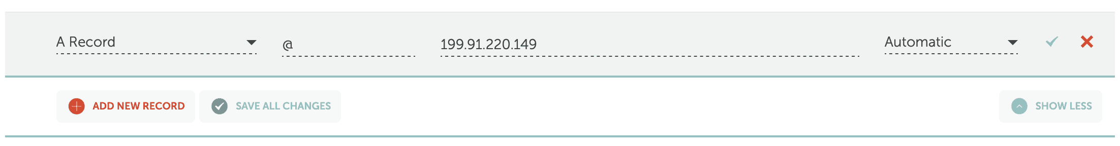 Choose "A Record" and enter the IP address of your new server in the "IP Address" field. If you're using your domain itself, enter @ in the "Host" field, otherwise enter the subdomain (for example, if you want your relay to be available at "relay.yourdomain.com", enter "relay".